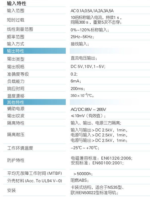 本产品采用特制隔离模块,对电网和电路中的交流电流进行实时测量,将其变换为0~5V、0~10V或1V~5V直流电压(UZ)输出;具有高精度、高隔离、低功耗、低漂移、温度范围宽、抗干扰能力强等特点。本产品采用卡装式结构,端子接线,安装方便,使用交流220V电源供电,输入、输出、电源之间两两隔离。