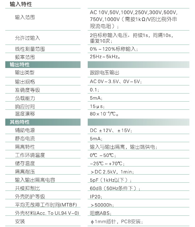 本产品采用特制隔离模块,对电网和电路中的工频交流电压进行实时测量,将其变换为标椎的跟踪电压(VG)输出;具有体积小、响应快、高精度、高隔离、低漂移、低功耗、温度范围宽等特点。本产品适用于电源设备、电力网监测自动化系统、工控监测系统、铁路信号系统等。