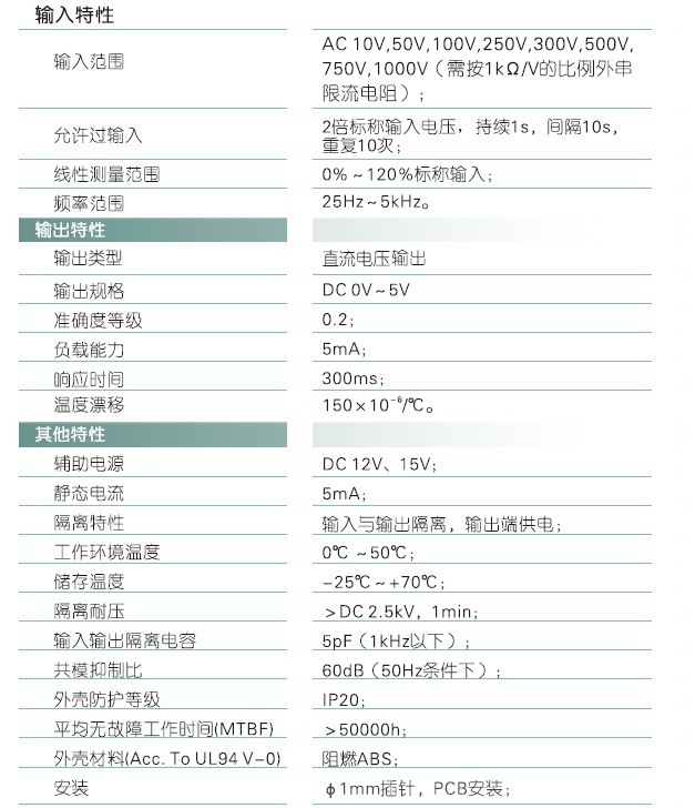 本产品采用特制隔离模块,对电网和电路中的工频交流电压进行实时测量,将其变换为标椎的直流电压(VZ)输出;具有高精度、高隔离、宽频响、低漂移、低功耗、温度范围宽、体积小等特点。本产品适用于电源设备、电力网监测自动化系统、工控监测系统、铁路信号系统等。