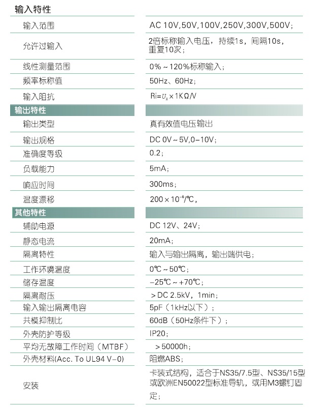 本产品采用特制隔离模块、真有效值变换原理,对电网和电路中的交流电压进行实时测量,将其变换为0V~5V或1V~5V直流电压(VZ)输出;适用于正弦波、非正弦波(矩形波、三角波、锯齿波及其他有较大失真波形)的电压隔离测量。本产品采用卡装式结构,端子接线,安装方便,可用在变频调速设备、可控硅控制设备用作真有效值的电压测量。