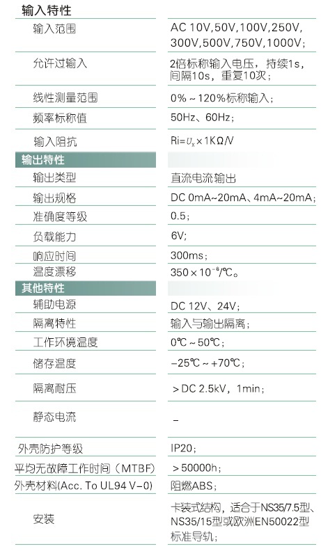 本产品采用特制隔离模块,对电网和电路中的交流电压进行实时测量,将其变换为二线制的4mA~20mA直流电流(IZ)输出,具有高精度、高隔离、低功耗、低漂移,接线简单,抗干扰能力强,便于信号远传等特点。本产品采用卡装式结构,端子接线,安装方便,适用于电源设备、电力网监测自动化系统、工控监测系统、铁路信号系统等。