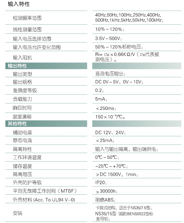 本产品采用光电隔离技术和F/V转换技术,对电网或电路中的频率信号进行实时测量,将频率信号变换为标准直流电压信号(Vz)输出;具有高精度、高隔离、低漂移、低功耗、宽温度范围等特点。本产品采用卡装式结构,端子接线,安装方便,适用于正弦波、非正弦波的频率测量。