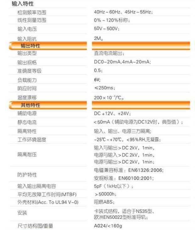 本产品采用光电隔离技术和F/V转换技术,对电网或电路中的频率信号进行实时测量,将频率信号变换为标准直流电流信号(Iz)输出;具有高精度、高隔离、低漂移、低功耗、宽温度范围等特点。本产品采用卡装式结构,端子接线,安装方便,适用于正弦波的频率测量。