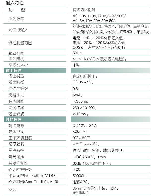 本产品采用特制隔离模块、专业MCU控制器、高速数据同步采集和数据快速处理技术,隔离测量单相电路的有功功率,将其变换为0V~5V直流电压(VZ)输出,具有高精度、高隔离、低功耗、低漂移、温度范围宽、抗干扰能力强等特点。本产品采用卡装式结构,端子接线,无需考虑输入信号的极性,安装方便,适用于电力网监测自动化系统、工控监测系统等。