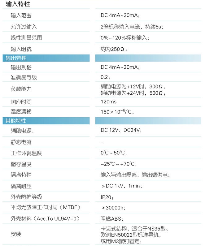 该产品是标准二线制直流电流调理器,采用光电隔离原理,能将4mA~20mA直流信号经电隔离后输出4mA~20mA直流信号。该产品输入、输出隔离,具有高隔离、高精度、低漂移、宽温度范围等特点。该产品主要用于抑制传感器及仪表传输过程中的强电干扰和共模干扰。特别适用于与有电隔离要求的传感器/变送器、仪表配合使用。该产品可广泛使用于计算机、PLC等测控系统及自动控制领域。