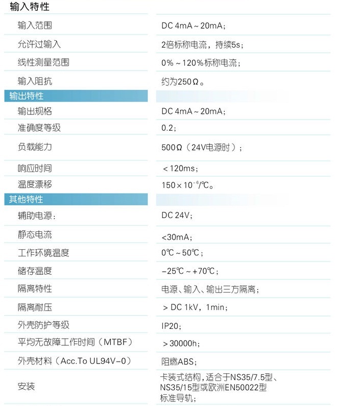 本产品采用线性光电隔离技术,隔离传送4mA~20mA直流电流信号。本产品输入、输出和辅助电源相互电隔离, 具有高准确度、高隔离、低功耗、低漂移、温度范围宽等特点。本产品主要用于抑制传感器及仪表输出信号传输过程中的强电干扰和共模干扰,特别适用于有电隔离要求的传感器/变送器及仪表配套。本产品采用卡装式结构,端子接线,安装方便。