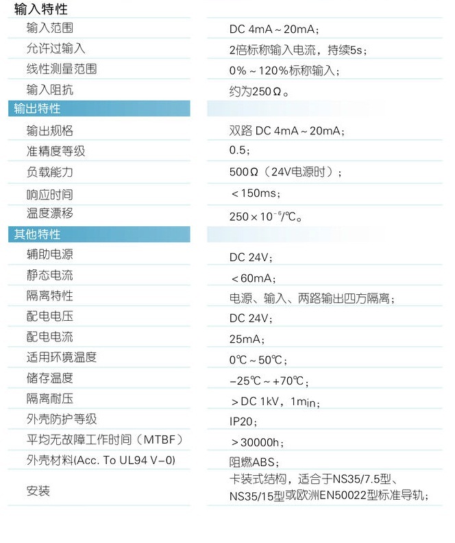 本产品采用线性光电隔离技术,将来自使用现场的4mA~20mA直流电流信号转换成经过电隔离的二路4mA~20mA标准直流电流信号,同时从输入端向用户配送24V电源;本产品为全隔离产品,即输入、2路输出和辅助电源相互电隔离。具有高精度、高隔离、低功耗、低漂移、温度范围宽等特点。本产品主要用于抑制传感器及仪表输出信号传输过程中的强电干扰和共模干扰,特别适用于有电隔离要求的传感器/变送器及仪表配套。本产品采用卡装式结构,端子接线,安装方便。