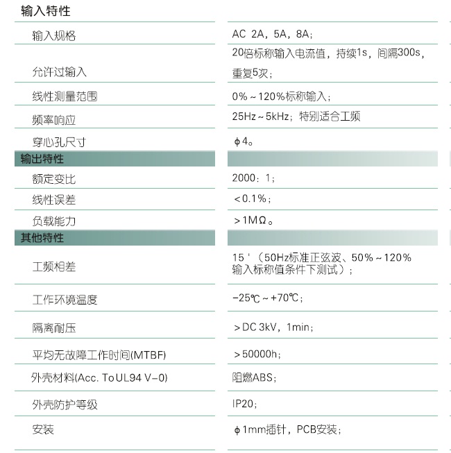 本产品采用特制隔离模块,将被测交流电流隔离转换成同频同相的交流电压信号;本产品无须辅助电源,具有体积小、可靠性高、线性好、响应快、性价比高等特点。本产品采用直插式结构,安装于印制板上使用,适用于电力系统的交流采样。