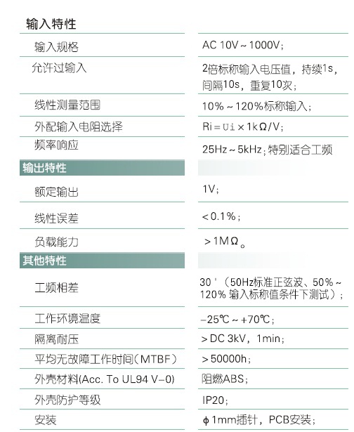 本产品采用特制隔离模块,将被测交流电压隔离转换成同频同相的交流电压信号。本产品无须辅助电源,具有体积小、可靠性高、线性好、无漂移、响应快、性价比高等特点。本产品采用直插结构,安装方便,适用于电力行业交流采样系统,尤其在铁路监测系统的移频通讯中应用最广。