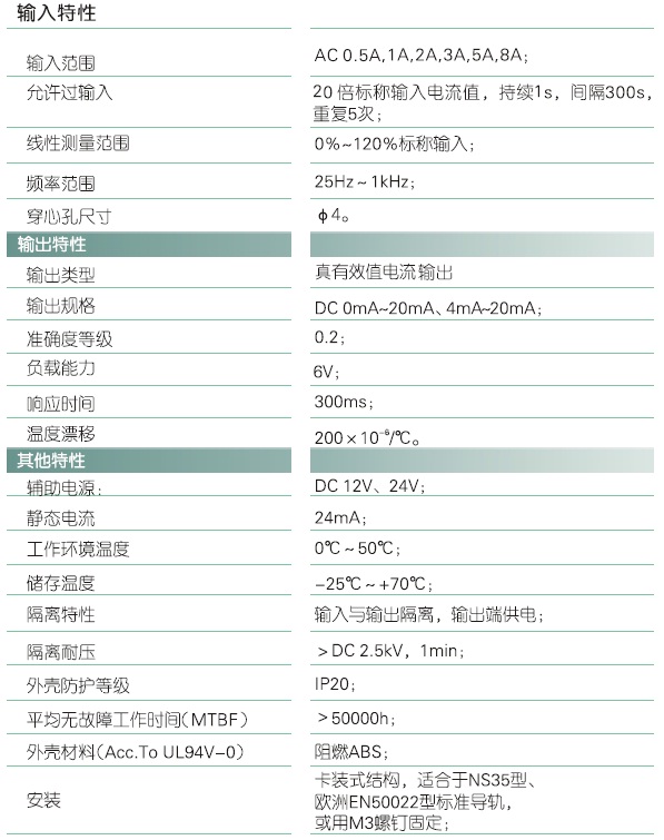 本产品采用特制隔离模块、真有效值变换原理,对电网和电路中的交流电流进行实时测量,将其变换为标椎的直流电流(IZ)输出;具有高精度、高隔离、低功耗、低漂移、抗干扰能力强等特点。适用于正弦波、非正弦波(矩形波、三角波、锯齿波及其他有较大失真波形)的电流隔离测量。本产品采用卡装式结构,端子接线,安装方便,可用在变频调速设备、可控硅控制设备中用作真有效值的电流测量。