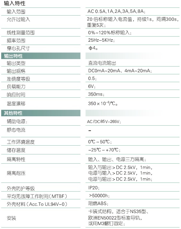 本产品采用特制隔离模块,对电网和电路中的交流电流进行实时测量,将其变换为4mA~20mA直流电流(IZ)输出;具有高精度、高隔离、低功耗、低漂移、温度范围宽、抗干扰能力强等特点。本产品采用卡装式结构,端子接线,安装方便,输入、输出、电源三隔离,适用于电源设备、电力网监测自动化系统、工控监测系统、铁路信号系统等。