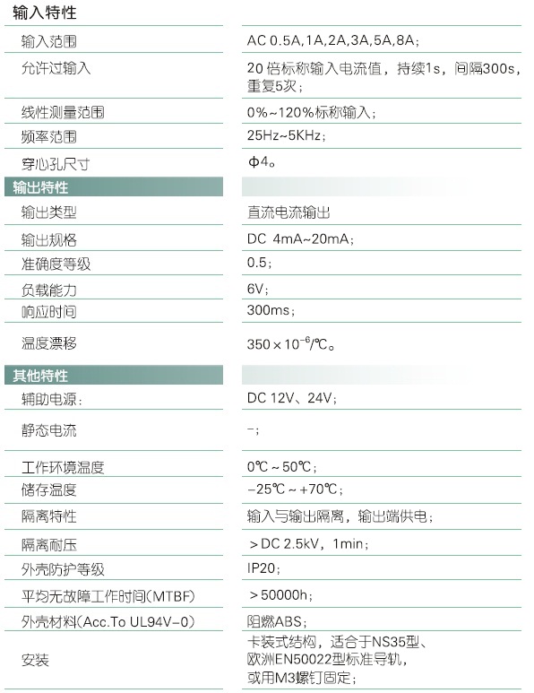本产品采用特制隔离模块,对电网和电路中的交流电流进行实时测量,将其变换为二线制的标准直流电流(IZ)输出;具有高精度、高隔离、低功耗、低漂移,接线简单,抗干扰能力强,便于信号远传等特点。本产品采用卡装式结构,端子接线,安装方便,适用于电源设备、电力网监测自动化系统、工控监测系统、铁路信号系统等。